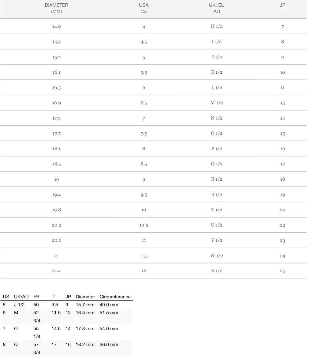 Using a pen or marker, mark on the tape where the end meets the snuggest part. Open the tape and you will see your measurement in millimeters. That will be the circumference of your finger. The conversion chart below will display your ring size.